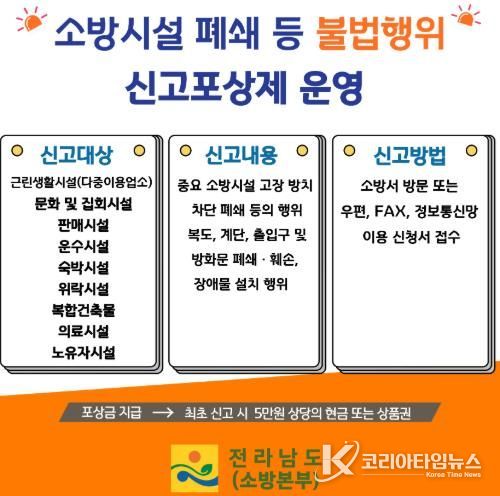 코리아타임뉴스 김태훈 기자 | 나주소방서는 소방시설에 대한 불법행위를 근절하고 자율적인 안전문화를 정착시키기 위해 연중 ‘불법행위 신고포상제’를 운영하고 있다고 21일 밝혔다.
