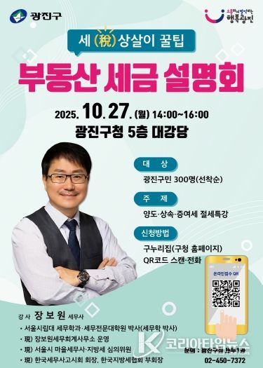코리아타임뉴스 오영주 기자 | 광진구는 10월 27일 오후 2시 광진구청 대강당에서 구민을 대상으로 ‘알기 쉬운 부동산 세금 설명회’를 개최한다.