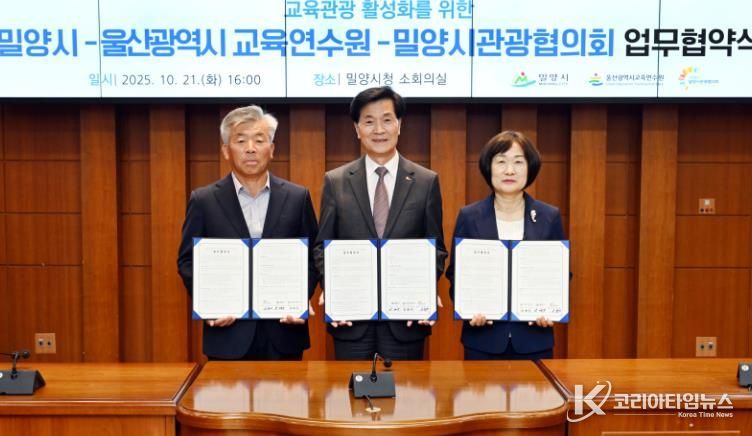 코리아타임뉴스 사회팀 | 울산교육연수원은 21일 밀양시청 소회의실에서 경남 밀양시, 밀양시관광협의회와 지역 자원을 활용한 현장 체험 연수 지원 등을 내용으로 하는 업무협약을 체결했다.