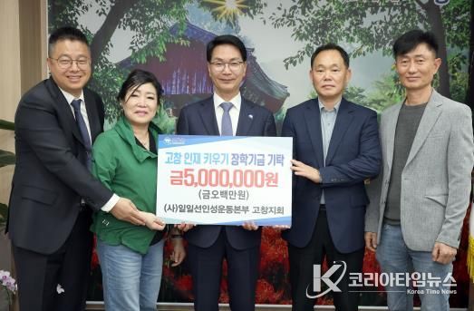 코리아타임뉴스 전북취재본부 | (사)일일선인성운동본부 고창지회가 지난 21일 고창군청을 찾아 500만원의 장학금을 기탁하며, 지역 학생들의 학업 의욕을 북돋우고 성장을 응원했다.