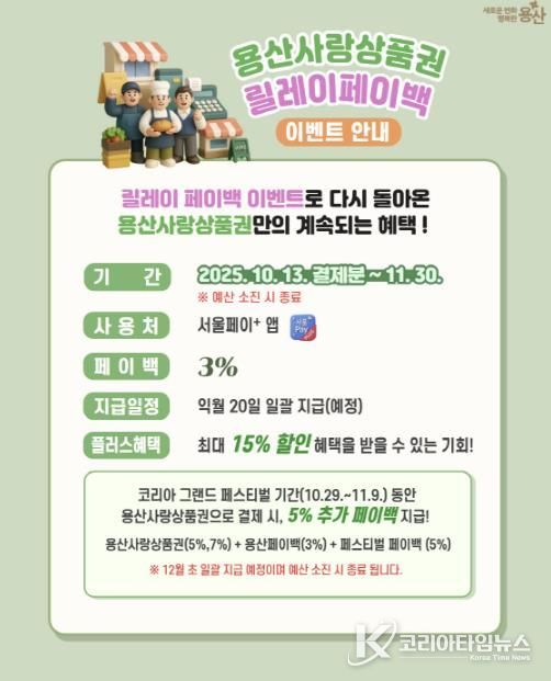 코리아타임뉴스 노승선 기자 | 서울 용산구는 지난 9월 16일부터 진행한 ‘추석맞이 용산사랑상품권 페이백 이벤트’가 예산 소진으로 10월 13일 종료됐으나, 구민들의 큰 호응에 힘입어 이벤트를 재개하기로 했다고 밝혔다.
