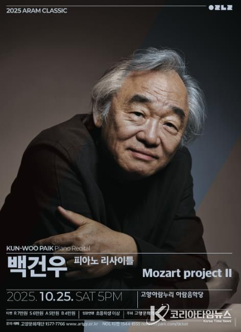 코리아타임뉴스 문화팀 | 모차르트의 세계를 통해 자신의 음악 인생을 되돌아보는 피아니스트 백건우가 오는 10월 25일 오후 5시, 고양아람누리 아람음악당 무대에 오른다. 이번 공연은 2024년부터 이어온 ‘모차르트 프로젝트’의 두 번째 시즌으로, 전국 17개 도시에서 순회 중인 〈백건우와 모차르트 – Mozart Project Ⅱ〉의 일환이다.