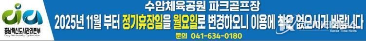 코리아타임뉴스 김택호 기자 | 지방자치단체조합 충남혁신도시관리본부는 충남 예산군 삽교읍 목리에 조성된 수암공원 파크골프장의 정기 휴장일을 2025년 11월 부터 수요일에서 월요일로 변경하여 운영한다고 밝혔다.