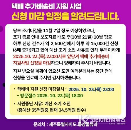 코리아타임뉴스 박찬식 기자 | 제주특별자치도는 택배 추가배송비 지원 사업이 당초 11월 7일 종료 예정이었으나, 신청 급증으로 10월 23일 오후 11시(방문 접수 오후 6시)에 조기 종료된다고 밝혔다.