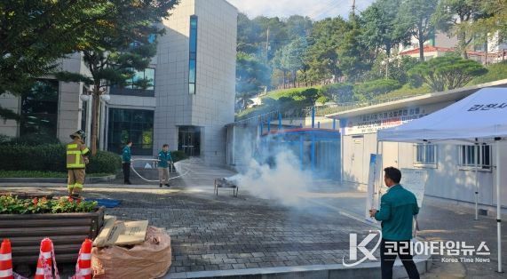 코리아타임뉴스 김태훈 기자 | 김천시는 10월 23일 목요일 오후 2시, 청사 화재에 대응하기 위해 대광119안전센터와 합동 소방 훈련을 시행했다.