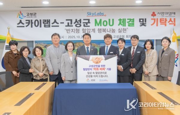 코리아타임뉴스 이아름 기자 | 평화 경제 거점 도시 강원 고성군은 2025년 10월 21일, 주식회사 스카이랩스와 함께 만성질환(고혈압, 심혈관 질환 등) 의료취약계층 지원을 위한 업무협약을 체결했다.