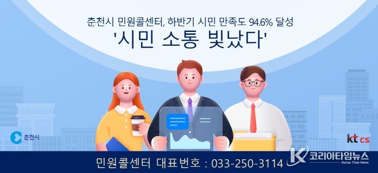 코리아타임뉴스 이아름 기자 | 춘천시 민원콜센터가 올 하반기 시민 만족도 조사에서 평균 만족도 94.6%를 달성, 시민 중심의 고품질 민원서비스 제공이 시민의 공감과 만족을 얻고 있는 것으로 나타났다.