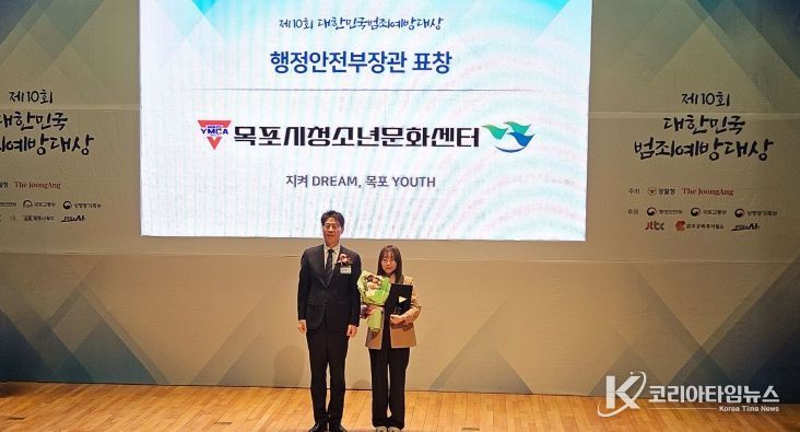 코리아타임뉴스 전남취재본부 | 목포시청소년문화센터(센터장 이수진)는 지역사회 위기 청소년 선도와 범죄예방에 기여한 공로를 인정받아 지난 10월 28일 열린 ‘제10회 대한민국 범죄예방대상’시상식(경찰청·중앙일보·JTBC 공동 주관)에서 행정안전부장관상을 수상했다.