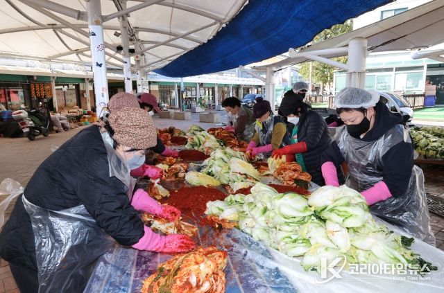 코리아타임뉴스 전북취재본부 | 무주반딧불시장 상인회가 지난 3일 시장 원형광장에서 김장 나눔 행사를 펼쳐 훈훈함을 전했다.