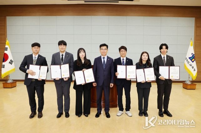 코리아타임뉴스 사회팀 | 충청북도교육청은 3일, 도교육청 화합관에서 열린 월례조회에서 2025년 친절교직원과 2025년 하반기 국민신문고 민원만족도 평가 우수 부서 및 직원에 대한 표창 수여식을 가졌다.