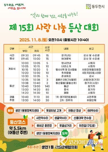코리아타임뉴스 경기취재본부 | 동두천시 생연1동 사회단체협의회는 오는 8일 시민이 함께하는 ‘제15회 사랑나눔 등산대회’를 개최한다고 밝혔다.