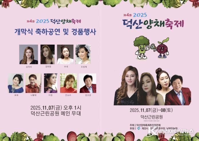 코리아타임뉴스 충북취재본부 | 제천시 대표 농산물 “양채”의 우수성을 널리 알리고, 농가 소득 증대 및 지역경제 활성화를 도모하기 위한 2025년 제4회 덕산 양채축제가 오는 11월 7일부터 8일까지 2일간 덕산근린공원(덕산면 도전리 367번지) 일원에서 개최된다.