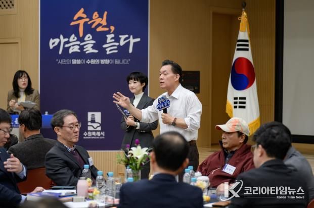 코리아타임뉴스 사회팀 | 3일 행궁동 선경도서관 강당에서 열린 27번째 새빛만남. 49년 동안 부녀회장으로 활동하고 있다는 전영숙 행궁동 새마을부녀회장이 질문 기회를 얻었다. 전영숙 회장은 12년 전 행궁동에서 열린 생태교통 수원 2013 축제 준비 과정을 회상하며 “낙후됐던 행궁동을 수많은 사람이 찾는, 아름다운 마을로 바꿔준 수원시에 감사드린다”고 말했다.