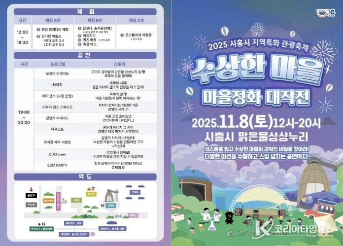 코리아타임뉴스 경기취재본부 | 시흥시는 2025년 시흥시 지역특화 관광축제 지원사업 선정 축제인 ‘수상한 마을 마을정화대작전’을 오는 11월 8일 정왕동 맑은물상상누리 일원에서 개최한다. 이번 축제는 시흥시 청년예술연합회가 주관한다.