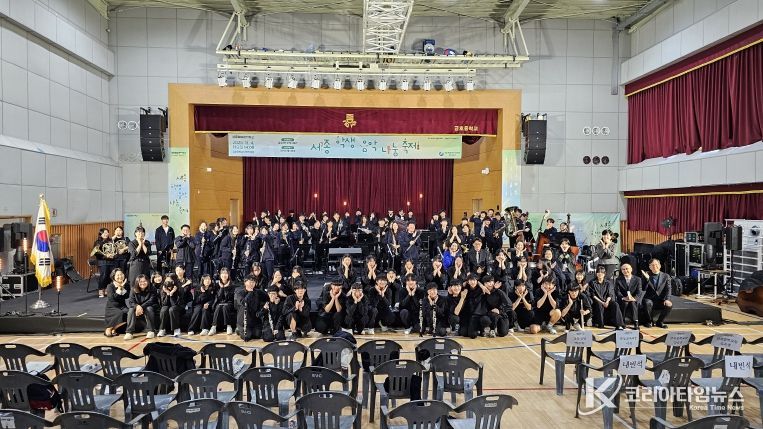 코리아타임뉴스 사회팀 | 세종특별자치시교육청은 11월 4일에 금호중학교 다목적강당에서 금호중학교(교장 강승연, 이하 금호중)의 ‘금호윈드오케스트라’(지도교사 조현영, 지휘자 연춘흠)와 연서중학교(교장 유효종)의 ‘연서오케스트라’(지도교사 이은정, 지휘자 김채연)가 함께 만드는 ‘2025 세종예술온(ON)학교’ 예술학교 ‘세종 학생 음악 나눔 축제’를 성황리에 마쳤다.