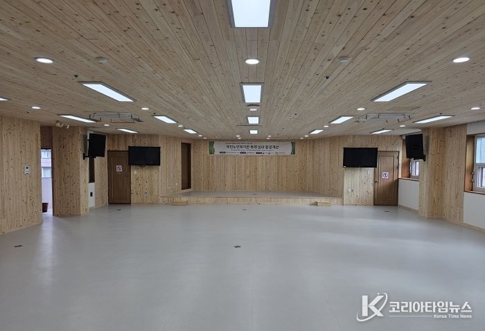 그동안 노후화된 벽면과 천장, 바닥으로 인해 이용자 불편이 제기됐던 대강당은 이번 공사에서 국산 친환경 목재를 중심으로 내부 마감과 시설 안전성을 개선했다. 목재 마감은 시각적 쾌적성뿐 아니라 실내 공기질 개선과 정서적 안정에도 긍정적 영향을 주는 것으로 알려져 있어, 지역 어르신들의 이용 만족도 향상과 건강 증진에 기여할 것으로 기대된다.