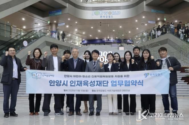 코리아타임뉴스 사회팀 | 안양시 인재육성재단은 10일 한국잡월드 숙련기술체험관 대회의실에서 직업진로체험 대표기관인 한국잡월드와 업무협약을 체결했다고 11일 밝혔다. 이번 협약은 안양시 어린이·청소년의 다양한 진로·직업체험 및 교육지원을 위해 양 기관이 상호협력을 강화하고자 추진됐다.