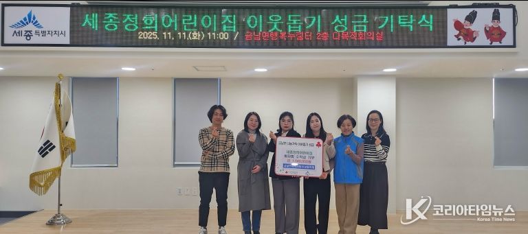 코리아타임뉴스 세종취재분부 | 세종특별자치시 금남면 세종정희어린이집(원장 박수진)이 11일 금남면지역사회보장협의체(공동위원장 이선영·박종설·이한월)에 이웃돕기 성금 104만 원을 전달했다.