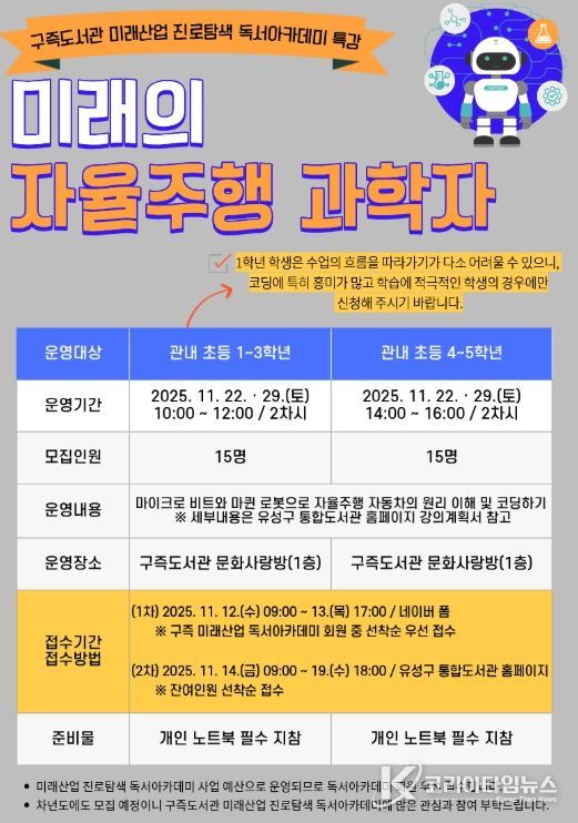 코리아타임뉴스 대전취재본부 | 대전 유성구 오는 22일과 29일 구즉도서관에서 관내 초등학생을 대상으로 ‘미래의 자율주행 과학자’ 과학 특강을 운영한다.