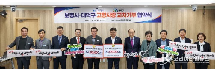 코리아타임뉴스 대전취재본부 | 대전 대덕구는 13일 충남 보령시와 보령시청에서 ‘고향사랑기부제 교차 기부 및 상호협력 업무협약’을 체결하며 지역 상생의 새로운 교류에 나섰다.