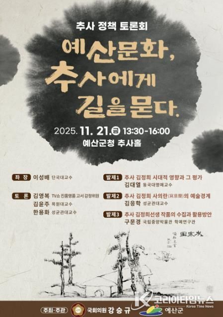 코리아타임뉴스 김택호 기자 | 예산군은 오는 11월 21일 오후 1시 30분부터 군청 추사홀에서 ‘예산문화, 추사에게 길을 묻다’를 주제로 ‘추사 정책토론회’를 개최한다고 밝혔다.