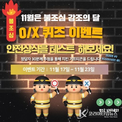코리아타임뉴스 김태훈 기자 | 전북특별자치도소방본부는 11월 ‘불조심 강조의 달’을 맞아 도민의 생활 속 화재예방 인식을 높이기 위한 SNS O/X 퀴즈 이벤트를 진행한다.