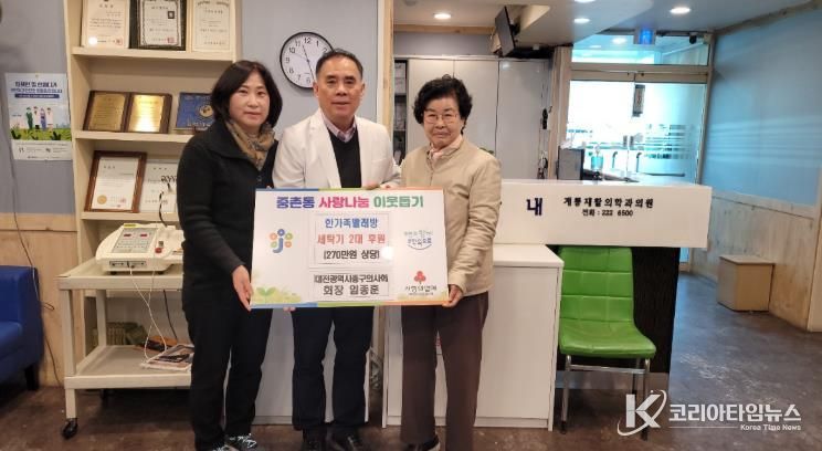 코리아타임뉴스 대전취재본부 | 대전 중구 중촌동은 대전중구의사회에서 지역 봉사활동 지원을 위해 중촌동 ‘한가족빨래방’에 세탁기 2대를 기탁했다고 17일 밝혔다.