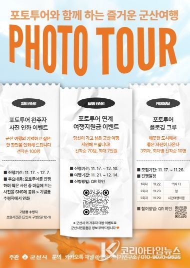 군산시 관계자는 “포토투어는 군산의 아름다운 풍경을 사진으로 기록하며 자연스럽게 군산의 다양한 관광지를 여행할 수 있는 프로그램.”이라며 “이번 이벤트를 통해 시민과 관광객 모두가 함께 참여하고 즐기며 군산에서 특별한 시간을 보낼 수 있기를 기대한다.”라고 말했다.
