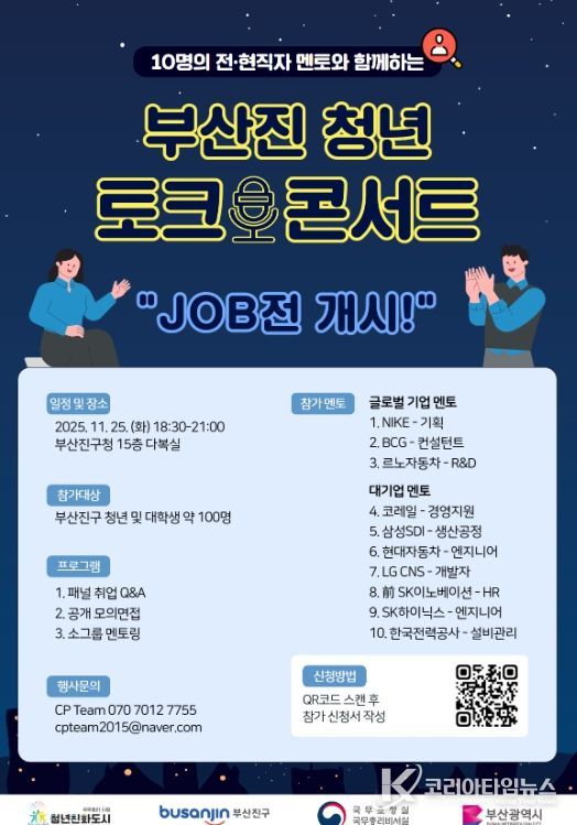 코리아타임뉴스 부산취재본부 | 부산진구는 오는 11월 25일, 청년들의 실전 취업역량 강화를 위해 ‘2025년 부산진청년토크콘서트-JOB전 개시!’를 개최한다고 밝혔다.