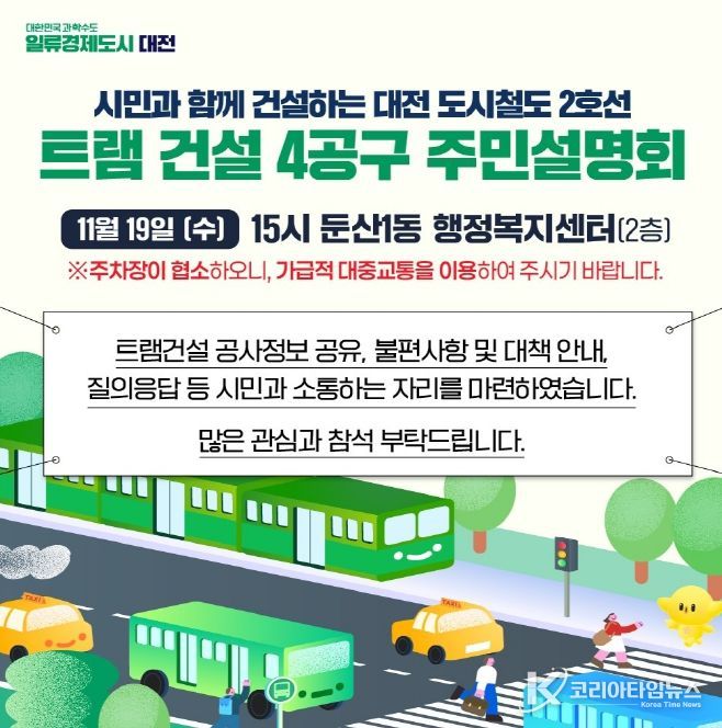 코리아타임뉴스 대전취재본부 | 대전시는 19일 오후 3시 둔산1동행정복지센터에서 도시철도 2호선 4공구(수정타운아파트~대전둔산경찰서) 건설공사와 관련한 주민설명회를 개최했다.