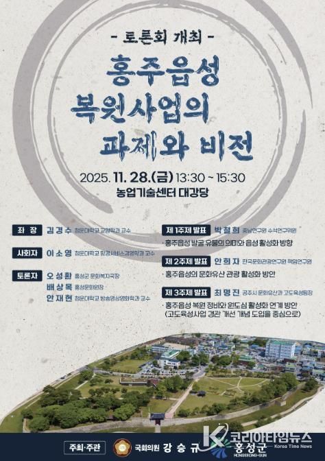 코리아타임뉴스 충남취재본부 | 홍주읍성 복원‧정비를 통해 지역의 정체성을 확립하고 이에 대한 성과를 공유하여 향후 지역발전의 초석 마련을 위한 ‘홍주읍성 복원사업의 과제와 비전 토론회’가 오는 28일 홍성농업기술센터 대강당에서 개최된다.