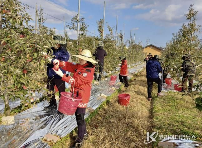이날 직원 30여 명은 월산리에 위치한 과수 농가를 방문하여 사과 수확 작업에 한마음으로 팔을 걷어붙였으며, 농가에 부담이 가지 않도록 작업 물품과 음료 등은 사전에 준비하여 농가의 부담을 덜어주었다.