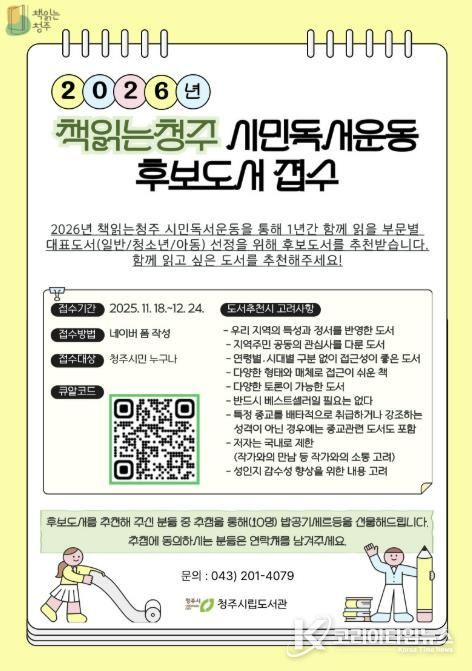 코리아타임뉴스 충북취재본부 | 청주시립도서관은 시민 독서운동 ‘책읽는청주’의 2026년도 대표도서 선정을 위해 오는 12월 24일까지 시민 추천을 접수한다고 21일 밝혔다.