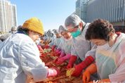 코리아타임뉴스 사회팀 | 용인특례시는 3일 ‘세리박(Seri Pak) with용인’에서 ‘2025 용인 온(溫)나눔 김장 페스티벌’이 열렸다고 밝혔다. 시민 주도형 자원봉사 프로그램 확산과 지역사회 통합을 목표로 마련된 이 행사는 재단법인 용인시자원봉사센터와 용인시 새마을회, 대한적십자사 용인시지구협의회가 공동으로 주최·주관했다. 행사에는 개인 자원봉사자를 비롯해 ▲용인애향회 ▲상상마을봉사단 ▲유림2동 통장협의회 ▲봉사단체 '이루다' ▲처인드리미봉사단 ▲심리미술봉사단 ▲씨담송 도시농업스쿨 ▲국제표준안전재단 ▲맑은천살리기실천운동본부 ▲녹색어머니회 등 9개 기관이 함께했다. 용인시자원봉사센터가 직접 운영하는 용인특례시 자원봉사대학 봉사단, 2030 청년봉사단과 시 협업기관인 ▲용인시청소년미래재단 ▲용인시산업진흥원 ▲용인시정연구원 관계자도 취약계층의 따뜻한 겨울나기를 위한 온기나눔에 동참했다. 이상일 시장은 여러 곳을 돌며 각 단체 관계자, 봉사자들과 함께 김장김치를 담았고, 시민들의 기념촬영 요청에 일일이 응했다. 이 시장은 작업이 끝난 뒤 인사말에서 “여러분이 오늘 담근 김장김치에는 우리