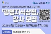 코리아타임뉴스 경기취재본부 | 광명시 평생학습원이 시민 맞춤형 평생학습 프로그램 ‘광명지식상점’을 운영할 2026년도 전문 교육 강사를 공개 모집한다. ‘광명지식상점’은 시민의 삶과 밀접한 주제를 중심으로 배움과 성장을 지원하는 광명시 대표 평생학습 프로그램이다. 2026년에는 ▲미래기술 ▲직무역량 ▲재무설계 ▲인문성찰 ▲관계학습 ▲시민학습 ▲기타 제안과정 등 7개 분야에서 강사를 선발해 시민들에게 다채로운 교육 서비스를 제공할 예정이다. 지원 자격은 해당 모집 분야의 전문성을 보유하고 관련 자격증과 실무경력을 모두 갖춘 자에 한한다. 시는 강의 경력, 강의계획서, 자기소개서 등을 바탕으로 1차 서류심사를 진행한 뒤, 수업 시연과 질의응답으로 구성된 2차 면접심사를 거쳐 최종 40여 명의 강사를 선발할 계획이다. 접수는 오는 12일부터 19일 17시까지 이메일 또는 평생학습원 2층 사무실 방문을 통해 가능하다. 제출 서류 등 세부 사항은 광명시 평생학습플랫폼 ‘광명이(e)지’ 공지사항에서 확인할 수 있다. 최종 합격자는 2월 중 ‘광명e지’에서 발표하며, 선발된 강사진은 3월부터 본격적