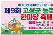 코리아타임뉴스 경남취재본부 | 고성군은 오는 11월 11일부터 12일까지 고성군스포츠타운 4구장에서 ‘제30회 농업인의 날 기념, 제9회 고성군 농축산물 한마당 축제’를 개최한다. 이번 행사는 고성군농업인단체협의회(회장 오태호) 주관, 고성군 후원으로 열리며, 농업인의 자긍심을 높이고 지역 농축산물 소비 촉진을 위해 마련됐다. 축제는 기념식과 축하공연, 농축산물 홍보 및 판매, 무료 시식회, 전시·체험 행사, 귀농귀촌·청년농업인·고향사랑기부제 홍보 등 다채로운 프로그램으로 구성된다. 11일 오전 10시부터 농축산물 직거래장터와 전시행사가 시작되며, 오전 10시 30분에는 여성농민회의 오카리나 연주와 퓨전국악 ‘화온’의 식전공연이 펼쳐진다. 이어 오전 11시에는 내빈소개, 개회선언, 국민의례, 유공자 시상(군수 2명, 의장 2명, NH농협고성군지부장 1명, 감사패 2명), 기념사 및 축사, ‘고성에는 고성쌀 강정’ 퍼포먼스가 진행된다. 오후에는 맥주 빨리 마시기 이벤트를 시작으로 트로트가수 한아름, 윤이나, 서백의 공연과 생활개선회의 난타, 전자현악그룹 아이리, 퍼포먼스팀 해피니스의 무대