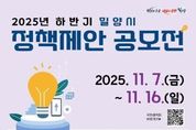 코리아타임뉴스 경남취재본부 | 경남 밀양시는 시민의 창의적인 아이디어를 시정에 반영하기 위해 오는 7일부터 16일까지 ‘2025년 하반기 정책제안 공모전’을 실시한다고 밝혔다. 이번 공모전은 △인구, 청년 △지역경제, 일자리, 산업 △문화, 관광 △보건, 복지 △주거, 안전, 환경 △농업, 기타 등 6개 분야로 나눠 진행되며, 밀양 시정에 관심 있는 국민 누구나 참여할 수 있다. 시는 이번 공모를 통해 시민과의 소통을 강화하고, 정책 수립 과정에 시민 참여를 확대해 실제 시정에 반영할 수 있는 창의적이고 현실적인 아이디어를 적극 발굴할 계획이다. 참여 방법은 국민권익위가 운영하는 국민생각함 또는 시 정책공모 담당자 이메일로 제출하면 되며, 우편 및 방문 접수(밀양시 밀양대로 2047, 밀양시청 5층 인구정책담당관실)도 가능하다. 접수된 제안은 △실시 가능성 △창의성 △효율성 △적용 범위 △계속성 등을 기준으로 담당 부서의 1차 내부 심사, 외부 전문가가 참여하는 2차 우수제안심사위원회 심사를 거쳐 최대 17건의 우수 제안이 선정된다. 선정된 제안에는 금상 1명(100만원), 은상 2명(