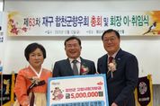 코리아타임뉴스 경남취재본부 | 합천군은 12일 대구 달서구 웨딩비엔나 컨벤션홀에서 열린 재구합천군향우회 정기총회에서 출향인들의 고향사랑기부금 기탁식이 진행됐다고 밝혔다. 이날 기탁식에는 재구합천군향우회 신임회장으로 취임한 김영현 씨와 (사)한국외식업중앙회 대구지회 달서구지부장 강영대 씨가 각각 고향사랑기부금 500만 원씩, 총 1,000만 원을 기탁했다. 김영현 신임회장은 합천군 야로면 덕암마을 출향인이다. 현재 경북 칠곡군 왜관읍에 소재한 자동차 부품 전문업체 태원오토텍(주)을 경영하며 지역 산업 발전과 고용 창출에 기여해오고 있다. 김 회장은 기업 활동과 더불어 고향에 대한 애정과 책임을 바탕으로 향우회 활동에도 적극 참여해 왔으며, 이번 신임회장 취임을 계기로 출향인 간 결속과 고향 발전을 위한 역할을 더욱 강화하겠다는 의지를 밝힌 바 있다. 강영대 지부장은 초계면 출신으로 재초계면합천군 향우회장으로 활동하며 고향 발전과 향우 결속을 위해 지속적으로 힘을 보태고 있다. 또한 지역에서 주왕산삼계탕을 운영하며 지역사회 공헌 활동에도 적극 참여해 왔다. 김윤