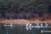 코리아타임뉴스 경북취재본부 | 맑게 갠 하늘 아래 울진군 연호공원에서 겨울 철새 고니가 힘차게 날아오르고 있다. 드넓은 연못을 품고 있는 연호공원과 전국 최대 생태경관보전지역인 왕피천은 매년 고니를 비롯한 다양한 철새들이 찾는 울진의 대표적인 생태 휴식처로, 자연과 사람이 공존하는 공간이다. 한겨울, 물살을 가르며 비상하는 고니의 모습이 고요한 연호공원에 생동감을 더하며 대한민국의 숨결을 고스란히 전하고 있다. 한편, 고니는 북반구 시베리아에서 번식하며, 겨울을 보내기 위해 10월에서 이듬해 3월까지 우리나라에 주로 머문다.