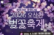 코리아타임뉴스 기동취재팀 | 오산문화재단은 오는 4월 3일 오후 6시 30분 오산천 야외무대(종합운동장 뒤편)에서 시민들과 함께하는 봄맞이 ‘2026 오산천 벚꽃 축제’를 개최한다. 이번 행사는 따뜻한 봄의 시작을 알리며 시민들에게 특별한 추억을 선사하기 위해 마련된 것으로, 가수 황민호의 축하 공연을 비롯해 점등식과 폭죽 퍼포먼스가 어우러져 오산천 일대를 화려한 봄밤의 분위기로 물들일 예정이다. 행사 당일에는 음악과 빛, 불꽃이 조화를 이루는 다양한 프로그램이 진행되며, 남녀노소 누구나 함께 즐길 수 있는 열린 문화행사로 시민들의 큰 호응이 기대된다. 오산문화재단 관계자는 “오산천에서 펼쳐지는 이번 축제가 시민들에게 특별한 봄밤의 추억으로 남길 바란다”며 “앞으로도 시민들이 일상 가까이에서 문화와 예술을 향유할 수 있도록 다양한 프로그램을 지속적으로 마련하겠다”고 밝혔다.