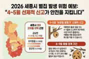 코리아타임뉴스 김태훈 기자 | 세종특별자치시 소방본부가 벌 쏘임 사고를 사전 예방하기 위해 '2026년 벌집 발생 위험 예측지도’를 제작·배포했다고 14일 밝혔다. 이 지도는 최근 3년간(2023∼2025년)의 벌집 제거 정보 기반으로 분석된 자료다. 분석 결과 관내 고위험 지역은 금남면과 조치원읍, 장군면 등으로 나타났다. 4∼5월은 여왕벌이 집터를 물색하고 산란을 시작하면서 신규 벌집이 발견되는 주요 기간이다. 이 시기에 작은 벌집이나 여왕벌을 발견해 신속히 관할 소방서에 신고하면 여름철 수천 마리로 증식하는 대형 벌집 형성을 사전 예방할 수 있다. 벌 쏘임을 예방하려면 야외 활동 시 향수나 화장품 사용을 자제하고, 어두운 색상보다는 밝은색 계열의 긴소매 옷을 착용해야 한다. 또한, 실수로 벌집을 건드렸을 경우 머리를 감싸고 신속히 20m 이상 벗어나야 한다. 벌에 쏘였을 경우엔 신용카드 등으로 벌침을 제거한 뒤 쏘인 부위에 얼음찜질을 하고 어지러움, 현기증, 두드러기, 호흡 곤란 등의 증상 시 즉시 관할 소방서(119) 신고해야 한다. 세종소방