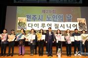 코리아타임뉴스 김태훈 기자 | 100세 시대를 맞아 전주지역 노인들의 행복하고 건강한 노후생활을 함께 염원하는 노인의날 기념식이 열렸다. 전주시와 대한노인회 전주시지회(지회장 홍성언)는 14일 전주학생교육문화관 공연장에서 우범기 전주시장과 최주만 전주시의회 부의장, 김두봉 대한노인회 전북특별자치도연합회장, 표창 수상자 등 1200여 명이 참석한 가운데 ‘제29회 전주시 노인의날 기념식’을 가졌다. 송민주 대한노인회 전주시지회 사무국장의 사회로 진행된 이날 기념식은 △무지개예술자원봉사단(단장 고대현)과 아름다운 실버 전주의꽃(단장 김인식)의 식전 공연 △노인 강령 낭독 △청려장(장수지팡이) 수여 △전주시장 및 전주시의장 표창 수여식 △노인복지공로자에 대한 공로장 수여식 등의 순으로 진행됐다. 특히 우범기 전주시장은 이날 기념식에서 올해 100세를 맞이한 김옥순 어르신(여, 덕진동)에게 무병장수의 상징인 청려지팡이를 전달했으며, 홍성언 지회장은 축하의 꽃다발을 선물했다. 홍성언 대한노인회 전주시지회장은 “풍성했던 한가위도 지나가고, 땀과 노력으로 이뤄낸 결실의 계절 가을을 맞이해 참석해 주신 우범기
