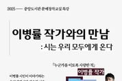 코리아타임뉴스 김택호 기자 | 아산시 중앙도서관은 오는 20일 오후 2시 중앙도서관 4층 강당에서 깊은 울림의 문학세계로 사랑받는 시인이자 수필가 이병률 작가를 초청해 특강 ‘이병률 작가와의 만남: 시는 우리 모두에게 온다’를 개최한다. 이번 강연은 9월부터 12월까지 중앙도서관에서 운영된 ‘문예창작교실’의 후속 특강으로, 시와 삶을 잇는 감성적 사유를 더 많은 시민과 나누기 위해 마련됐다. 이병률 작가는 『누군가를 이토록 사랑한 적』, 『바다는 잘 있습니다』, 『바람이 분다 당신이 좋다』, 『끌림』, 『혼자가 혼자에게』 등 다수의 작품을 통해 시대의 감정과 아름다움의 본질을 섬세하게 포착해 왔으며, 국내외 다양한 강연을 통해 독자들과 폭넓게 소통해 왔다. 이번 강연에서는 그가 세상을 껴안고 이해하는 방식과 아름다움을 찾아가는 이야기들을 직접 들려주며, ‘왜 지금 우리에게 시가 필요한가?’라는 질문을 중심으로 시가 건네는 울림에 관한 생각을 시민들과 나눌 예정이다. 참가 대상은 아산시민(성인) 100명이며, 참가를 희망하는 시민은 12월 10일(수) 오전 10시부터 아산시립도서관 누리집을 통해 선착