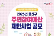 코리아타임뉴스 노승선 기자 | 서울 용산구가 4월 24일까지 2027년 예산에 반영할 주민참여예산 사업을 공모한다. 생활안전, 문화, 복지 등 주민 생활과 밀접한 분야를 대상으로, 총규모는 10억 원이다. 일반사업은 사업당 2억 원 이내, 행사성 사업은 1500만원 이내로 제안할 수 있다. 단, 이미 시행 중인 사업이나 법령‧조례상 부적합한 사업, 구 소관사무가 아닌 사업, 특정 민간단체지원을 목적으로 하는 사업 등은 선정 대상에서 제외한다. 사업 제안은 용산구민과 용산구에 소재지를 둔 사업체 임직원이나 학생이라면 모두 가능하다. 신청은 기간 내 ▲구 누리집 ‘참여소통-주민참여예산제-용산구 예산 이렇게 사용해주세요!’ 게시판 ▲방문(용산구청 기획예산담당관 및 각 동주민센터) ▲우편(녹사평대로 150, 8층 기획예산담당관) ▲전자우편 중 편한 방법으로 제출하면 된다. 제안 양식은 구 누리집 ‘주민참여예산 게시판’에서 내려받을 수 있다. 접수한 제안 사업은 ▲동 지역 회의 ▲소관부서 검토 ▲주민참여예산위원회 심사 절차를 거쳐 최종 선정한다. 이후 구의회 심의를 통해 2027년 예산으로 확정할 예정이다. 주민참여예산