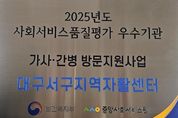코리아타임뉴스 대구취재본부 | 대구 서구지역자활센터는 보건복지부 주관 2025년 가사·간병 방문지원사업 품질 평가에서 전국 349개소 중 상위 9개소에 해당하는‘우수 기관’으로 선정됐다. 이번 평가는 ▲기관 운영 ▲제공 인력 및 인적자원관리 ▲서비스 제공 및 평가 ▲서비스 성과 ▲현장 평가단 등 5개 영역에서 실시됐으며, 서구지역자활센터는 전 영역에서 90점 이상의 높은 점수를 획득하며 탁월한 운영 역량을 입증했다. 우수 기관으로 선정된 서구지역자활센터는 포상금과 함께 보건복지부 장관 상장, 우수 기관 현판을 수여받는 영예를 안았다. 이는 지역사회 내 돌봄서비스의 질적 향상과 지속 가능한 가사간병방문지원사업 운영에 큰 동력을 제공할 것으로 기대된다. 류한국 서구청장은 “앞으로도 가사·간병 방문 지원 서비스 대상자에게 질 높은 서비스를 제공하고, 제공 인력인 요양보호사들에게 건강하고 내실 있는 일자리를 제공할 수 있도록 서구지역자활센터를 지속적으로 지원하겠다.”라고 밝혔다.