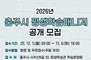 코리아타임뉴스 박찬식 기자 | 충주시가 주민의 근거리 학습권 보장과 지역 특성에 맞는 평생학습 실현을 위해 ‘2026년 충주시 평생학습매니저’를 공개 모집한다고 28일 밝혔다. 이번 모집은 읍면동 평생학습센터를 중심으로 지역 곳곳의 학습 현장을 지원하고 시민 참여형 평생교육 기반을 강화하고자 마련됐다. 지원 자격은 충주시 주민등록자로서, 충주시에서 운영한 △충주시 평생학습매니저 양성과정 △읍면동 평생학습매니저 양성과정 △행복학습매니저 양성과정 △2025 평생학습매니저 양성과정(건국대 RISE 협업) 중 1개 이상을 수료해야 한다. 선발된 평생학습매니저는 2026년 1월부터 12월까지 읍면동 평생학습센터 프로그램 운영 및 모니터링, 지역 주민 맞춤형 학습 기획, 학습자 상담 및 만족도 조사, 평생교육 주요 사업 및 행사 운영 지원, 홍보 활동 등 현장에서 다양한 역할을 맡는다. 모집 기간은 12월 1일부터 9일까지 총 15명을 선발하며, 접수는 충주시 평생학습관(충주시 사직산6길 20) 방문 또는 우편 제출로 하면 된다. 선발 절차는 서류 및 면접 심사로 진행되며, 최종 결과는 12월 2