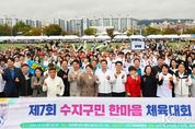 코리아타임뉴스 사회팀 | 용인특례시 수지구는 18일 아르피아 상부 체육시설에서 ‘제7회 수지구민 한마음 체육대회’를 개최했다. 수지구 체육연합회가 주최·주관한 이번 대회엔 구민 약 2000여 명이 참여해 승부차기, 볼풀공 바구니농구, 줄다리기, 계주 등으로 구민 모두 한마음으로 어우러지는 시간을 보냈다. 또 식전 공연인 동천동 훌라댄스, 신봉동 밸리댄스와 단국대학교 치어리딩팀 ‘아스테르’의 공연, 퓨전 장구, 보컬그룹 ‘뮤랑’, 마술사 홍승인, 초대 가수 김성환 등이 다채로운 무대를 선보였다. 행사장 곳곳에선 화분 만들기, 친환경 리필스테이션(세제 담아가기), MBTI 검사, 캘리그라피 체험, 키링 만들기, 구민 건강 서비스 안내 부스 등 체험 프로그램이 운영됐다. 이상일 시장은 “우리 수지구민들이 모처럼 한자리에 모여 우정을 나누면서 행사를 통해 행복한 시간을 많이 보내시라고 비가 그친 것 같다”며 “수지중앙공원은 축구장 76개 크기의 시민 힐링 공간으로 조성되고 있고, 상현3동 행정복지센터와 함게 건립되는 광교스포츠센터에는 25m레인 10개의 수영장이 들어서게 된다"며 "서울종합운동장역과 수서역