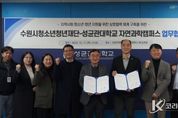 코리아타임뉴스 사회팀 | 수원시청소년청년재단은 11일 성균관대학교 자연과학캠퍼스와 청소년ㆍ청년의 취‧창업 지원과 전인적 성장을 위한 업무협약(MOU)을 체결했다고 밝혔다. 이번 협약을 통해 양 기관은 △대학생 연계사업 활성화를 위한 지속적인 교류활동 추진 및 내실화 △청소년의 진로 탐색을 위한 멘토링 및 학과 탐방 기회 제공 △기타 상호 협력이 필요하다고 인정되는 분야에서의 협조 체계를 구축할 예정이다. 재단 관계자는 "이번 협약이 단순한 형식적 절차에 머무르지 않고 우리 청소년‧청년들에게 새로운 경험과 지속적인 성장의 기회를 제공하는 중요한 출발점이 되기를 희망한다"며, "협약의 성공적인 이행을 위해 상호 긴밀하게 협력해 나갈 것"이라고 밝혔다.