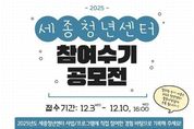코리아타임뉴스 세종취재분부 | 세종일자리경제진흥원이 운영하는 세종청년센터가 센터 사업 및 프로그램 참여자들의 경험과 이야기를 담기 위한 ‘2025년 세종청년센터 참여 수기 공모전’을 개최한다. 이번 공모전은 센터 사업 및 프로그램에 참여한 청년들의 다양한 사례를 수집하고, 현장에서 느낀 진솔한 경험담을 통해 청년들의 참여 의미를 더욱 널리 알리기 위해 마련됐다. 공모 분야는 총 3개 유형이다. ▲유형1은 세종청년센터 사업 및 프로그램 참여 청년, ▲유형2는 청년도전지원사업 참여 청년, ▲유형3은 청년성장프로젝트 참여 청년을 대상으로 하며, 1인당 1편만 응모할 수 있다. 참여 방식은 자유주제로, 2025년도 센터 사업 및 프로그램 참여 경험을 바탕으로 A4 1~4매(500자 이상)의 한글 파일 형식의 수기를 작성해 제출하면 된다. 공모 접수는 10일 16시까지이며, 세종청년센터 홈페이지에서 신청서를 내려받아 수기와 함께 제출하면 된다. 센터 사업에 참여한 세종시 청년이라면 누구나 지원할 수 있다. 참여자 모두에게는 세종청년마일리지 ‘세마일’* 20,000점이 적립되며, 부문별 ▲최우수