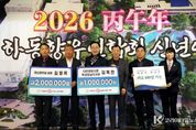 코리아타임뉴스 오영주 기자 | 하동군은 지난 9일 개최된 ‘전국하동향우연합회 2026년 신년인사회’에서 김영목 마산향우회장과 김옥찬 대한경제신문 부산·경남 지사장이 각각 고향사랑기부금 200만 원, 100만 원을 전달했다고 밝혔다. 이날 행사에는 황갑선 전국하동향우연합회장을 비롯한 각 지역 향우회 임원과 지역 인사들이 참석해 새해 인사를 나누고, 고향 하동의 지속 가능한 발전 방향을 논의했다. 김영목 회장과 김옥찬 지사장의 고향사랑기부는 이러한 뜻깊은 날에 의미를 더하며 함께 새해를 맞이하는 향우들의 끈끈한 연대와 우정을 보여줬다. 하승철 하동군수는 감사의 인사를 전하며 “고향사랑기부는 내 고향에 대한 마음을 전할 수 있는 소중한 수단이 되어주고 있다. 소중한 기부금을 군민들이 가장 필요한 곳에 사용하겠다”라고 말했다. 한편, 고향사랑기부제는 개인이 현재 주소지를 제외한 지방자치단체에 연간 최대 2천만 원까지 기부할 수 있는 제도이다. 10만 원 이하는 전액 세액 공제, 10만 원 초과 20만 원 이하는 44%, 20만 원 초과분에 대해서는 16.5%의 세액 공제 혜택이 주어지며, 누